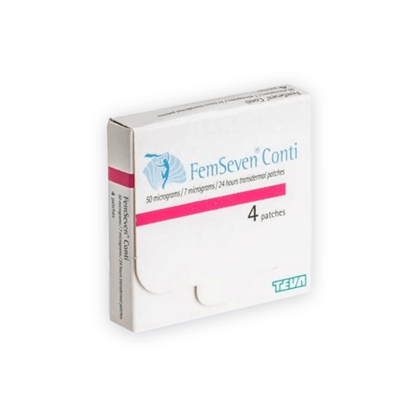 FemSeven Conti Patches are a continuous combined hormone replacement therapy (HRT) used to relieve menopausal symptoms such as hot flushes, night sweats, mood swings, and vaginal dryness. They contain estradiol (oestrogen) to replace declining hormone levels during menopause and levonorgestrel (a progestogen) to protect the womb lining from the effects of oestrogen. The patches are worn continuously and changed once a week, releasing hormones steadily through the skin into the bloodstream. FemSeven Conti is suitable for women who have not had a period for at least a year and also helps maintain bone health after menopause.