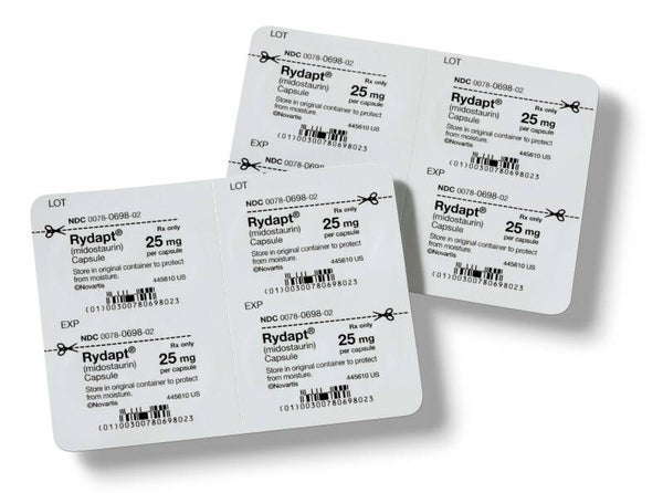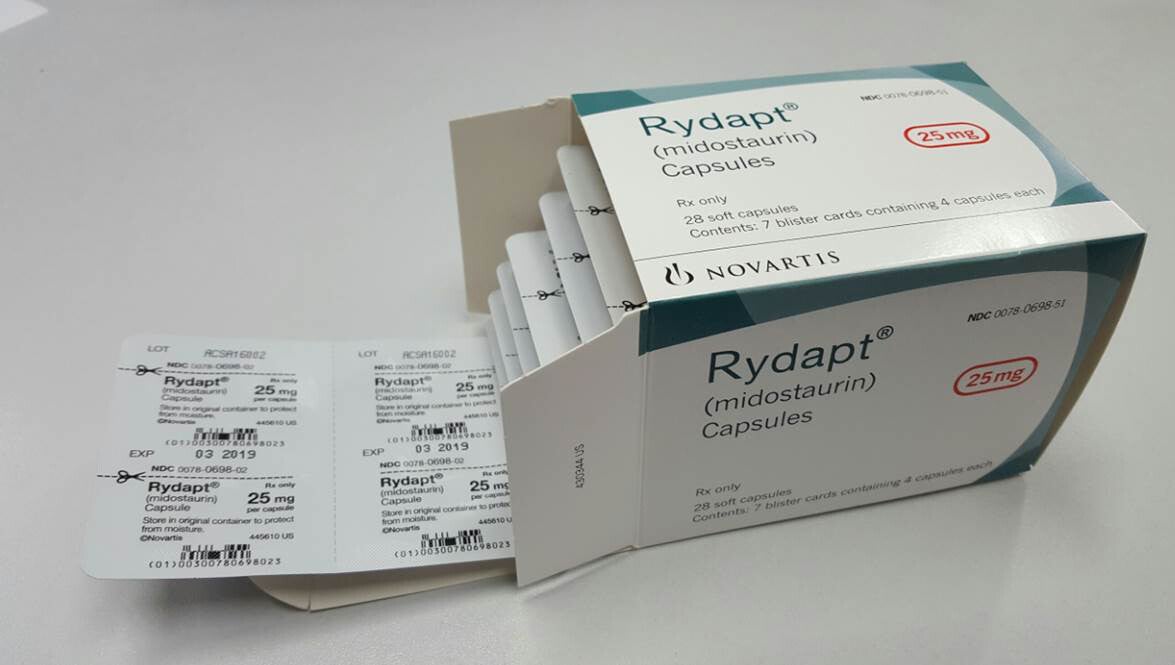 Rydapt (midostaurin) is a medication used for the treatment of patients with newly diagnosed acute myeloid leukemia (AML), aggressive systemic mastocytosis (ASM), systemic mastocytosis with associated hematological neoplasm (SM-AHN), or mast cell leukemia (MCL).